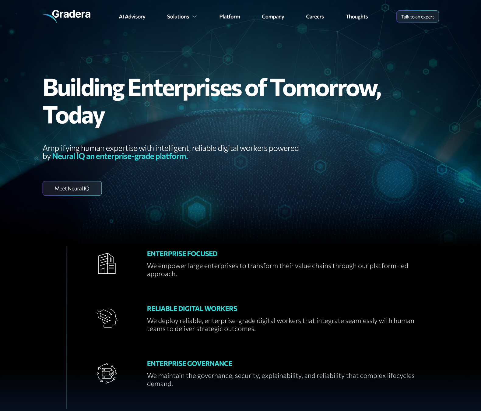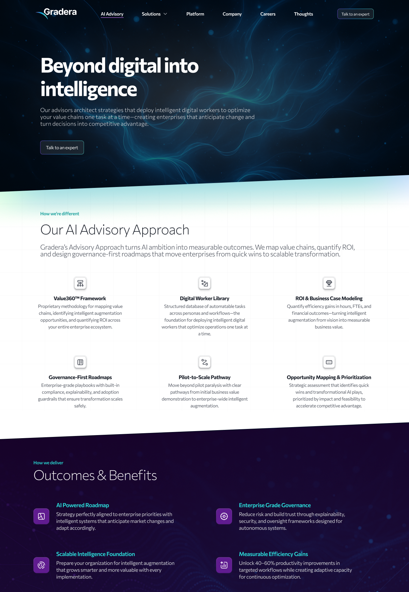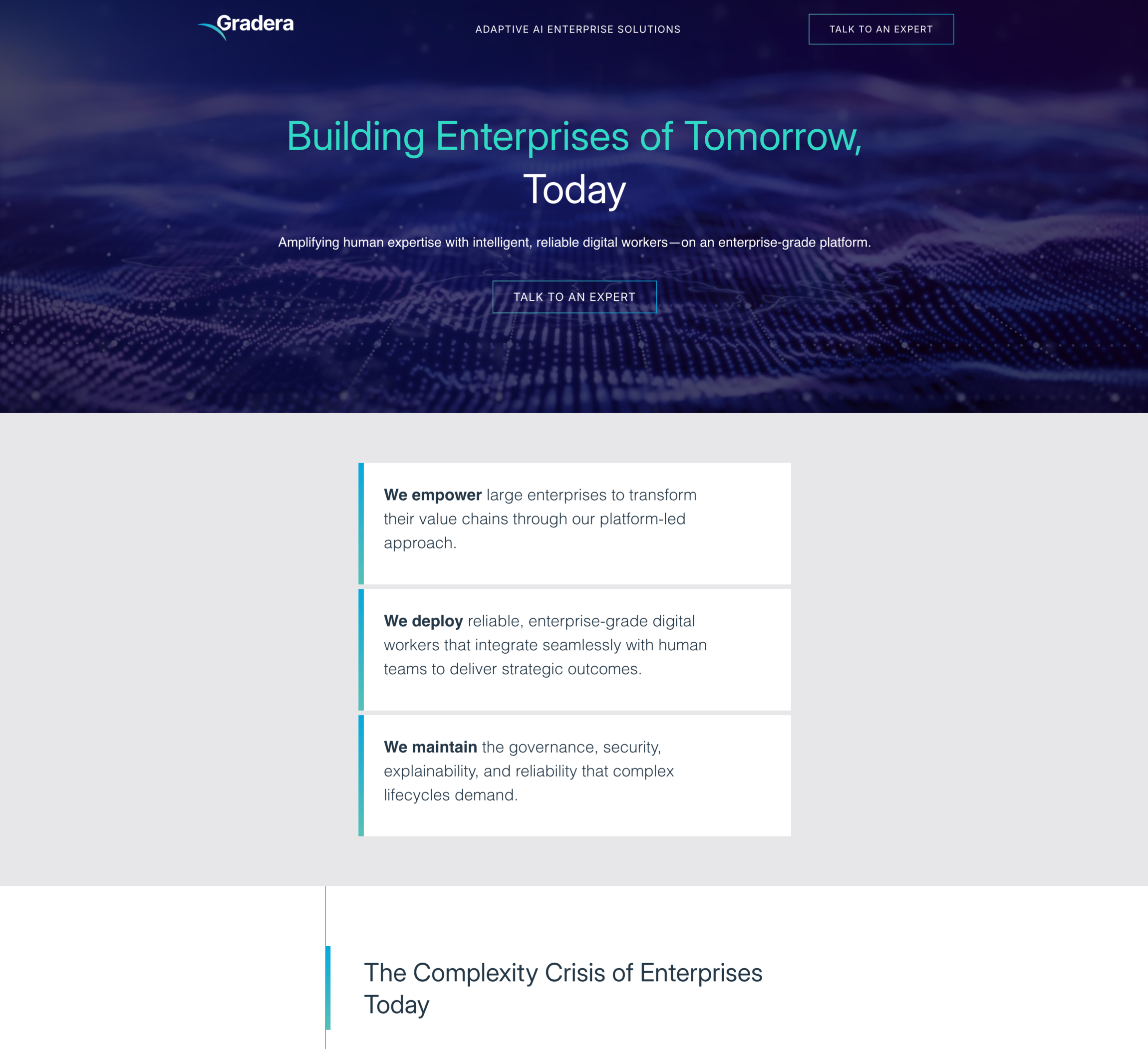 The existing single-page site relied on outdated, service-oriented language that lacked depth, clarity, and credibility. It did not articulate what Gradera was building, how it was different, or why it mattered. Despite positioning itself as an AI-driven digital services company, the digital presence failed to signal that sophistication to prospective buyers.