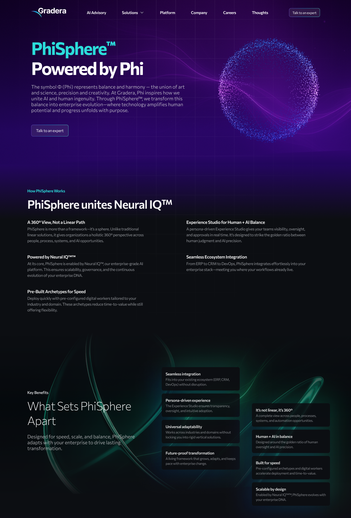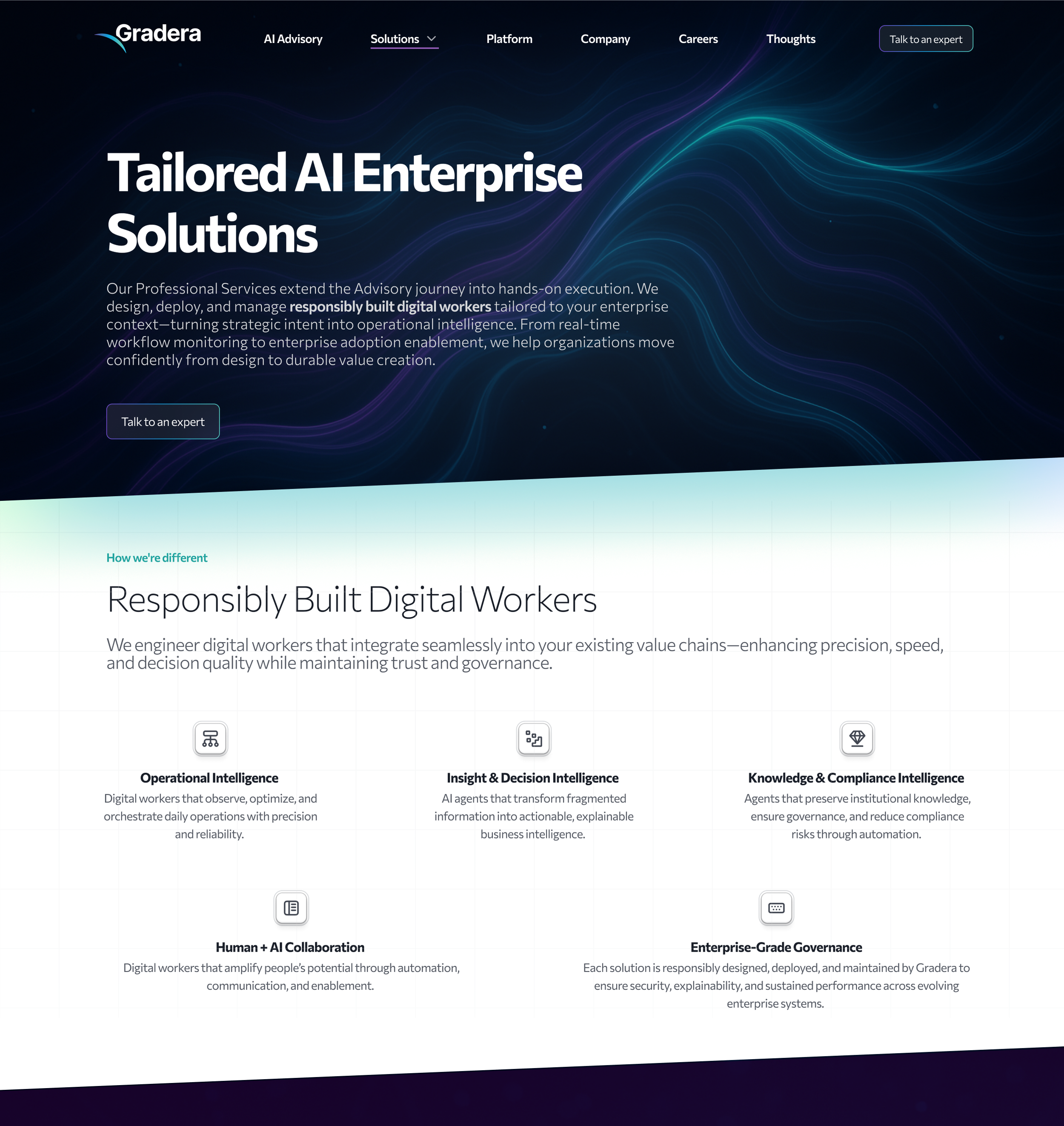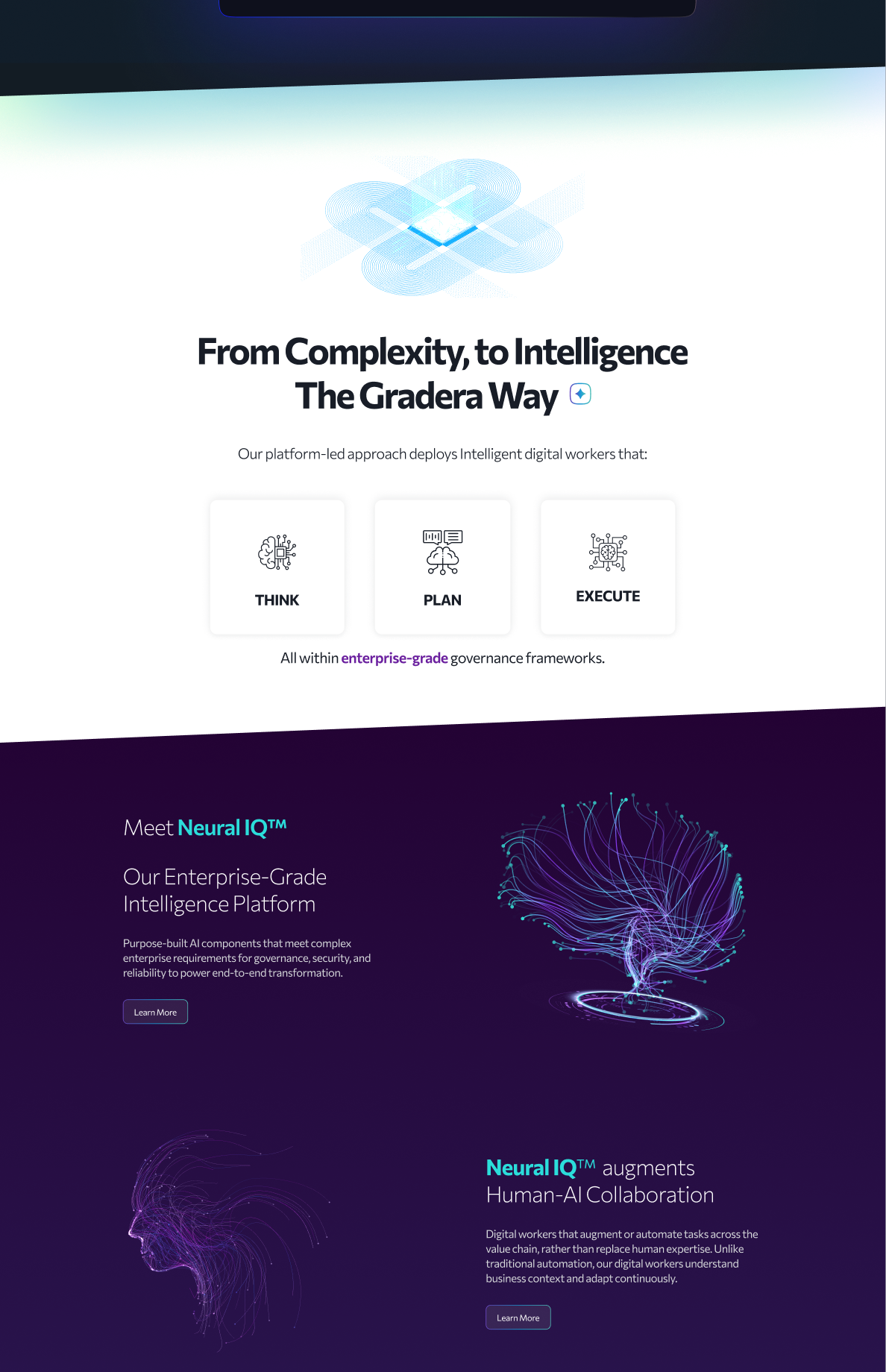 The existing single-page site relied on outdated, service-oriented language that lacked depth, clarity, and credibility. It did not articulate what Gradera was building, how it was different, or why it mattered. Despite positioning itself as an AI-driven digital services company, the digital presence failed to signal that sophistication to prospective buyers.