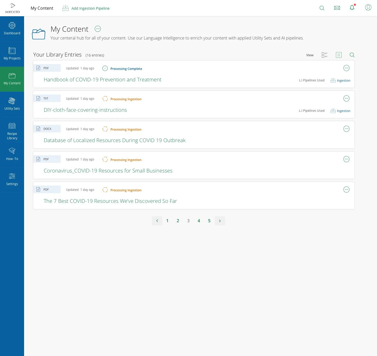 Ingestion became a structured experience: naming projects, selecting data sources, configuring pipelines, enriching content, and applying layered processing toward defined outcomes. These steps were intentionally surfaced in a way that made complex orchestration feel coherent rather than abstract.